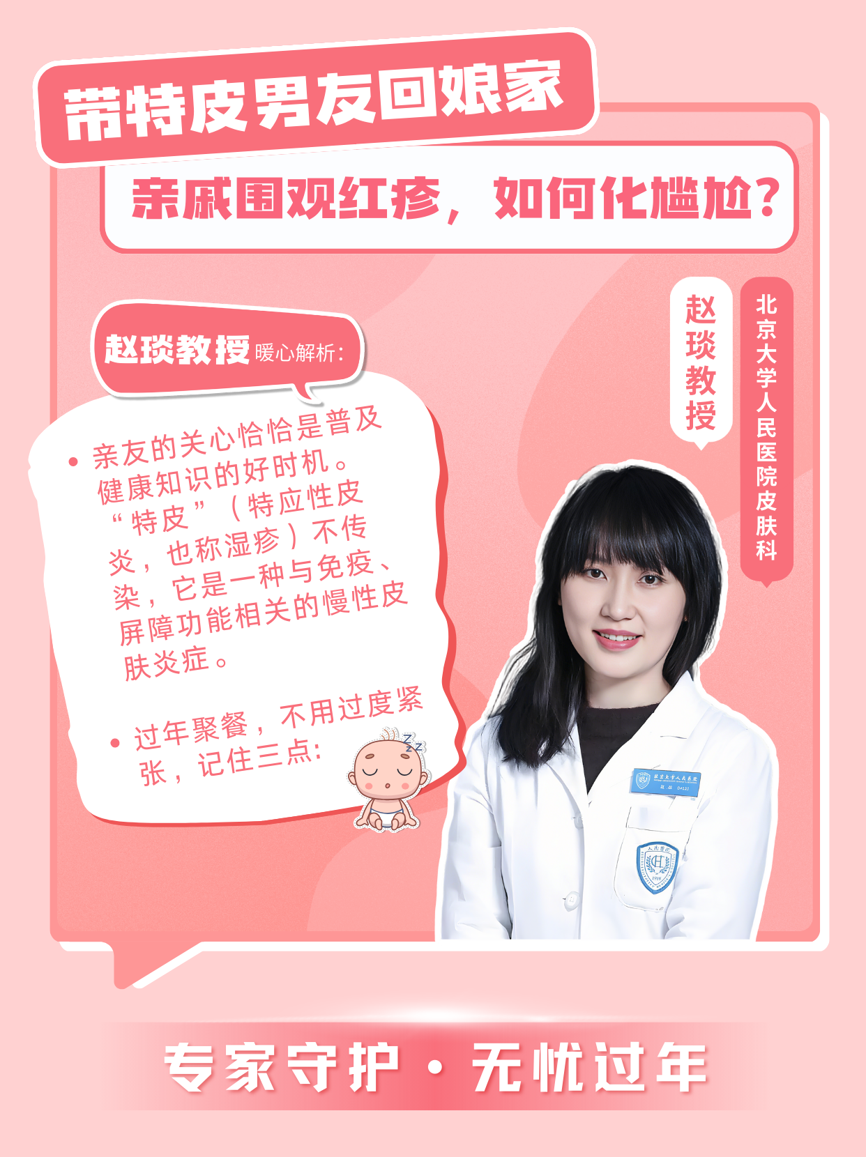 “親友的誤解恰恰是普及健康知識(shí)的好時(shí)機(jī)。‘特皮’(特應(yīng)性皮炎,也稱濕疹)不傳染,它是一種與免疫、屏障功能相關(guān)的慢性皮膚炎癥。過年聚餐,不用過度緊張,記住三點(diǎn):