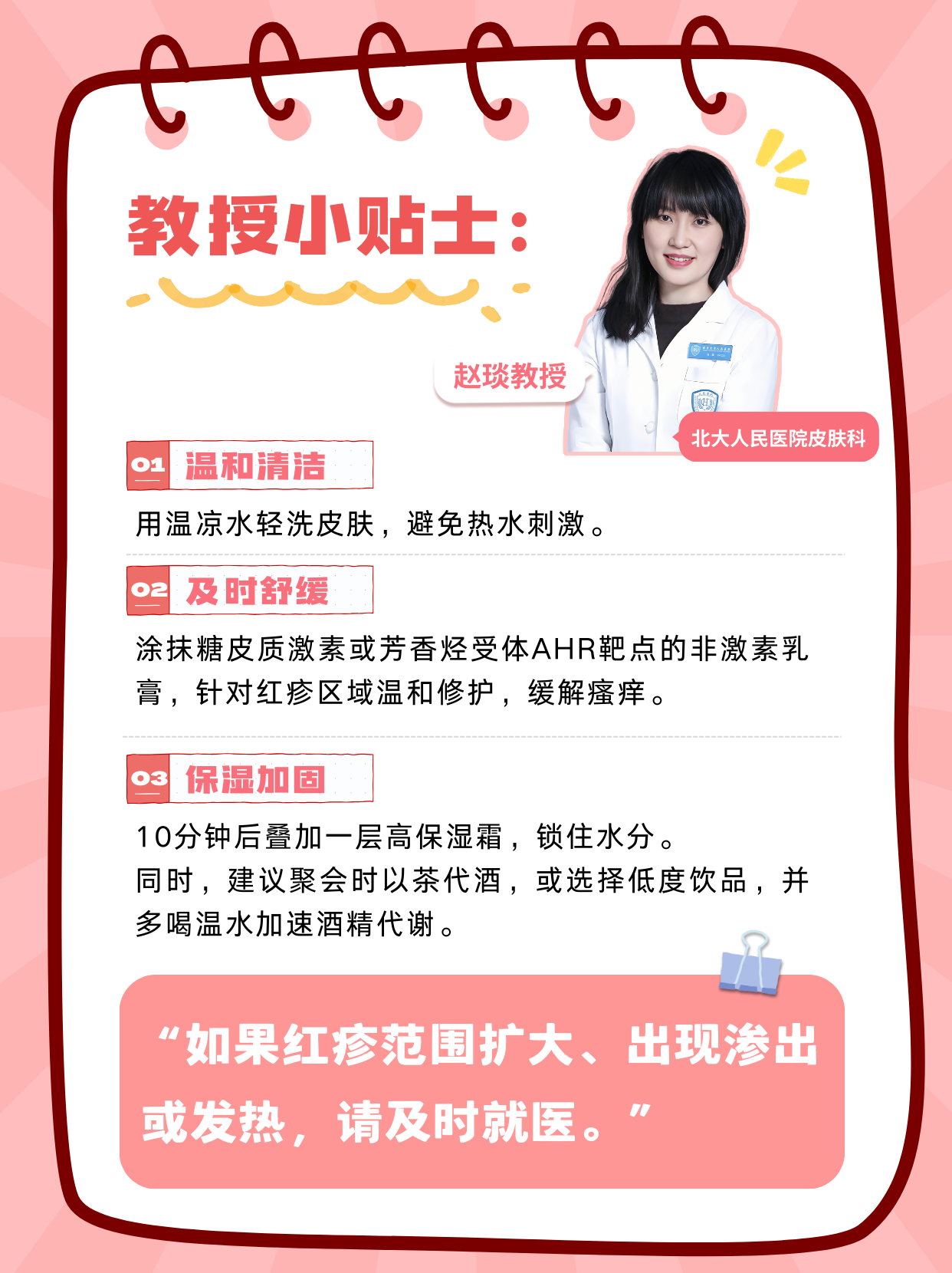 “如果紅疹范圍擴(kuò)大、出現(xiàn)滲出或發(fā)熱,請(qǐng)及時(shí)就醫(yī)。”