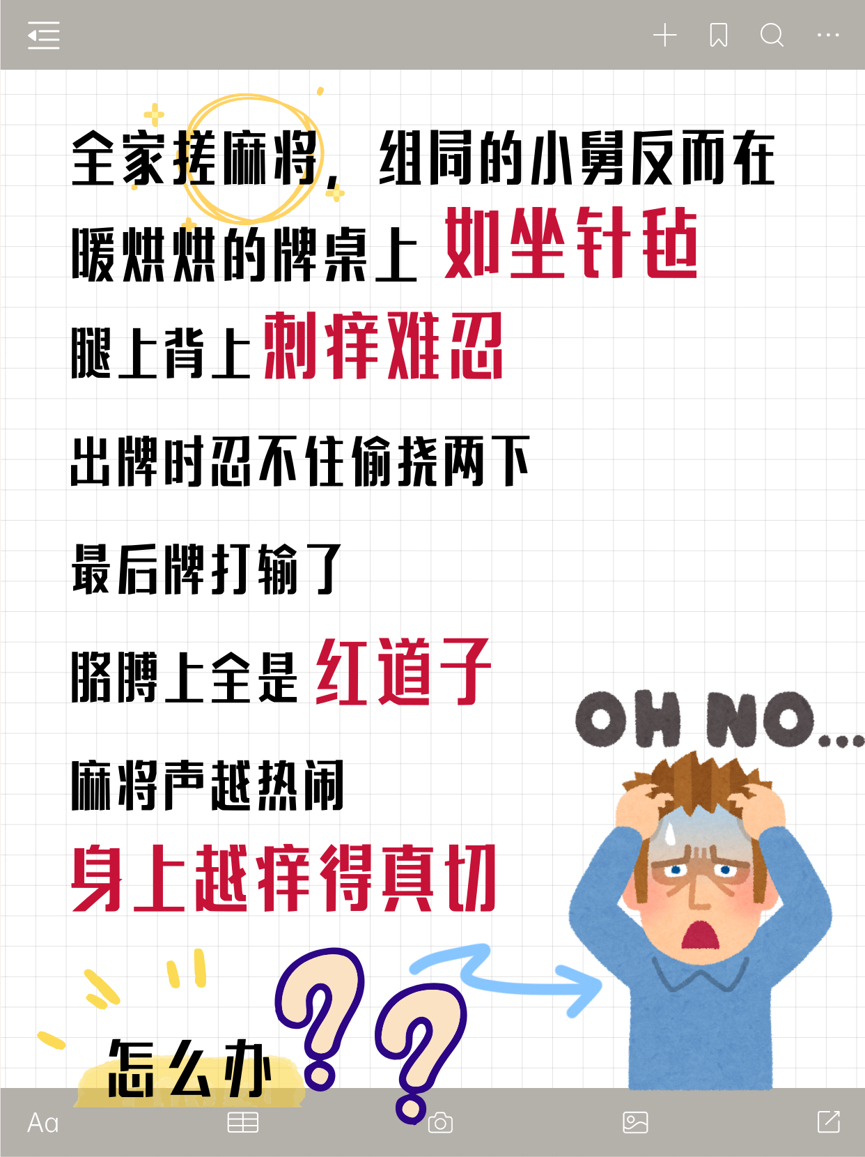 腿上背上刺癢難忍,出牌時(shí)忍不住偷撓兩下,