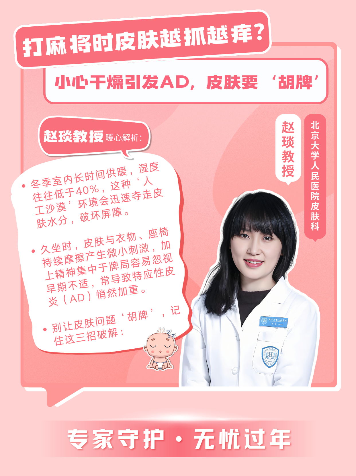“冬季室內(nèi)長時(shí)間供暖,濕度往往低于40%,這種‘人工沙漠’環(huán)境會(huì)迅速奪走皮膚水分,破壞屏障。久坐時(shí),皮膚與衣物、座椅持續(xù)摩擦產(chǎn)生微小刺激,加上精神集中于牌局容易忽視早期不適,常導(dǎo)致特應(yīng)性皮炎(AD)悄然加重。別讓皮膚問題‘胡牌’,記住這三招破解:
