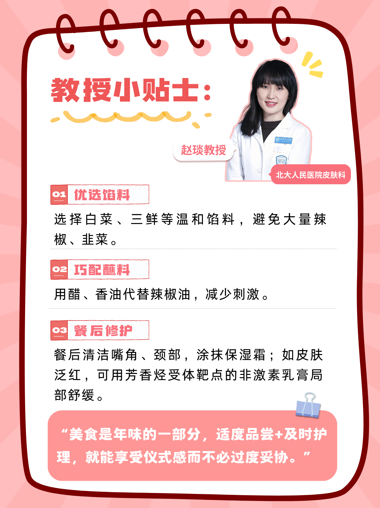 “節(jié)日美食當(dāng)前卻要克制,確實(shí)需要很大的心理能量。特應(yīng)性皮炎患者的皮膚屏障較脆弱,辛辣刺激、部分海鮮或發(fā)酵食物可能誘發(fā)或加重炎癥反應(yīng)。但‘迎財(cái)神’的團(tuán)圓時(shí)刻,完全不必把自己隔離在美食之外。”可以: