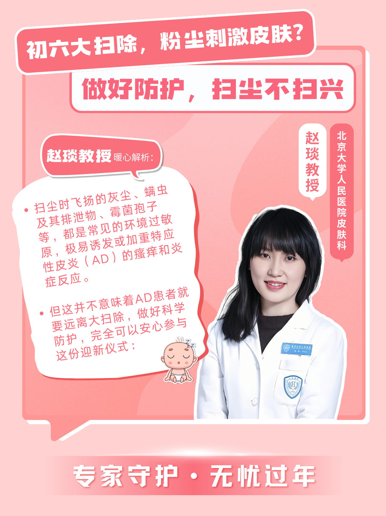 “掃塵時(shí)飛揚(yáng)的灰塵、螨蟲及其排泄物、霉菌孢子等,都是常見的環(huán)境過敏原,極易誘發(fā)或加重特應(yīng)性皮炎(AD)的瘙癢和炎癥反應(yīng)。但這并不意味著AD患者就要遠(yuǎn)離大掃除,做好科學(xué)防護(hù),完全可以安心參與這份迎新儀式: