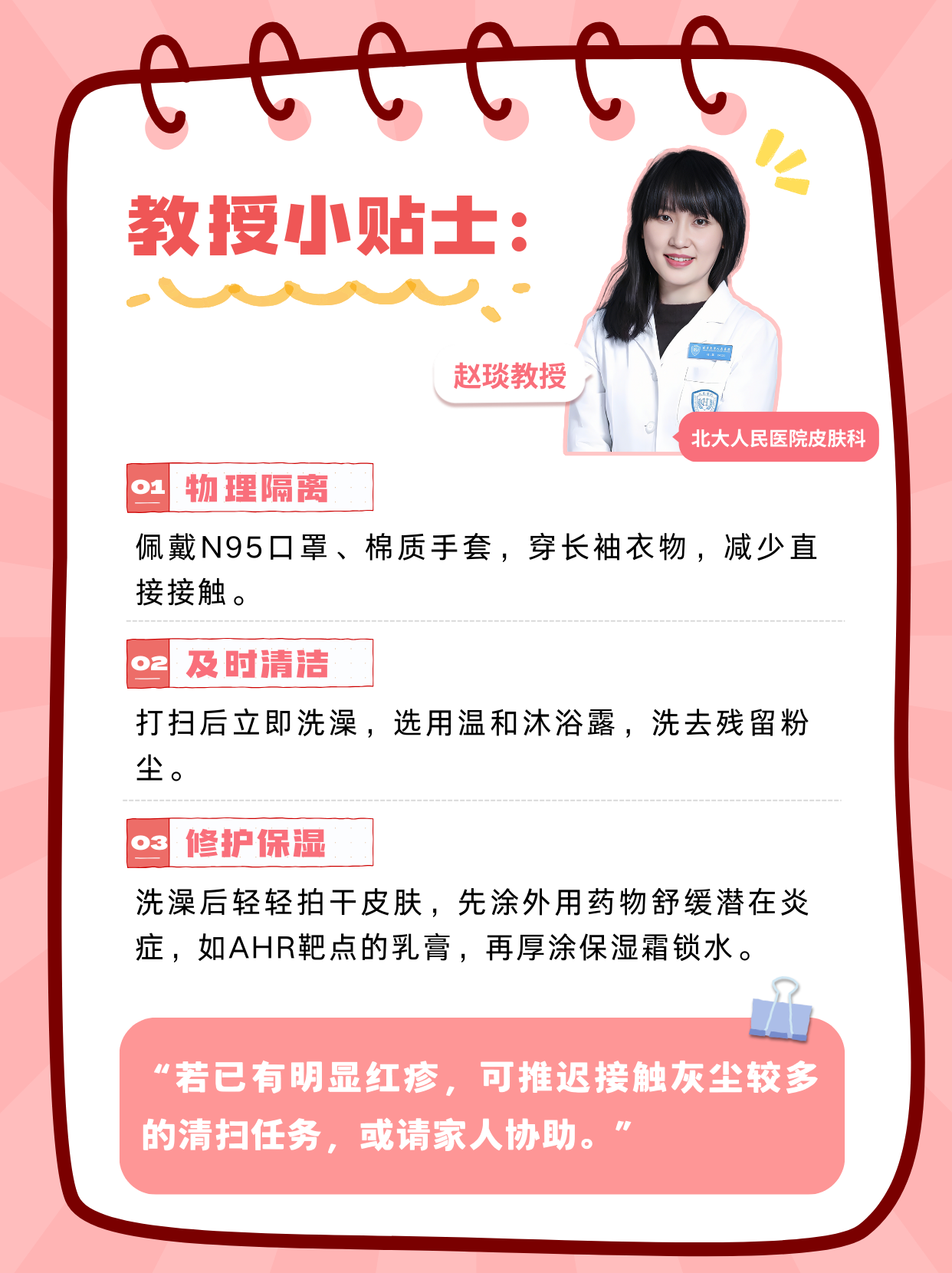 “若已有明顯紅疹,可推遲接觸灰塵較多的清掃任務(wù),或請(qǐng)家人協(xié)助。”