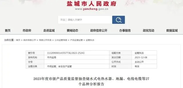 2023年度鹽城市市場監(jiān)督管理局委托江蘇威諾檢測技術(shù)有限公司組織實(shí)施儲(chǔ)水式電熱水器產(chǎn)品市級監(jiān)督抽查。本次抽查計(jì)劃5批次,抽到5批次,經(jīng)檢驗(yàn)合格5批次。
