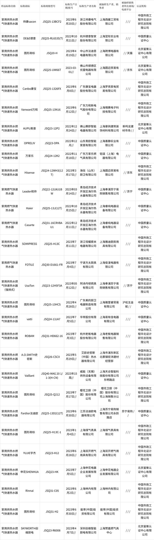 2023年上海市家用燃氣快速熱水器產品質量監(jiān)督抽查不合格產品