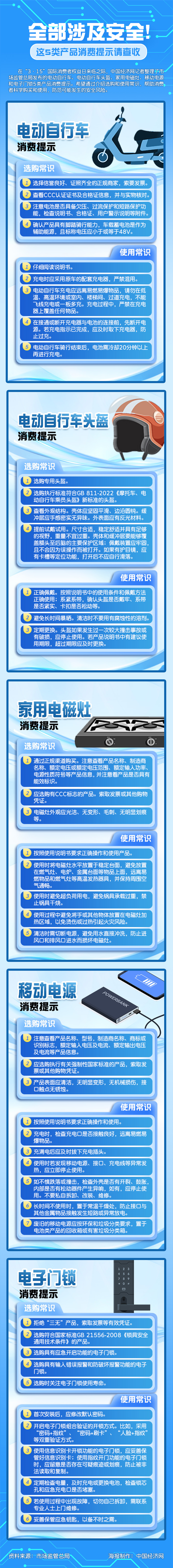在“3·15”國際消費者權(quán)益日來臨之際,中國經(jīng)濟網(wǎng)記者整理了市場監(jiān)管總局發(fā)布的電動自行車、電動自行車頭盔、家用電磁灶、移動電源和電子門鎖5類產(chǎn)品消費提示。希望通過介紹選購和使用常識,幫助消費者科學購買和使用,防范可能發(fā)生的安全風險。(中國經(jīng)濟網(wǎng)記者 佟明彪)