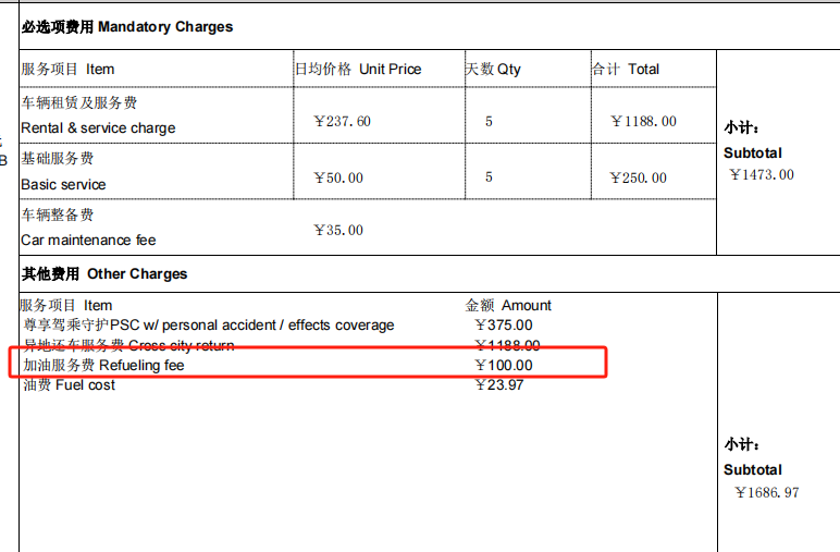神州租車(chē)還表示,即便還車(chē)地點(diǎn)周邊沒(méi)有加油站,只要車(chē)輛缺油也依然會(huì)被收取“加油服務(wù)費(fèi)”。