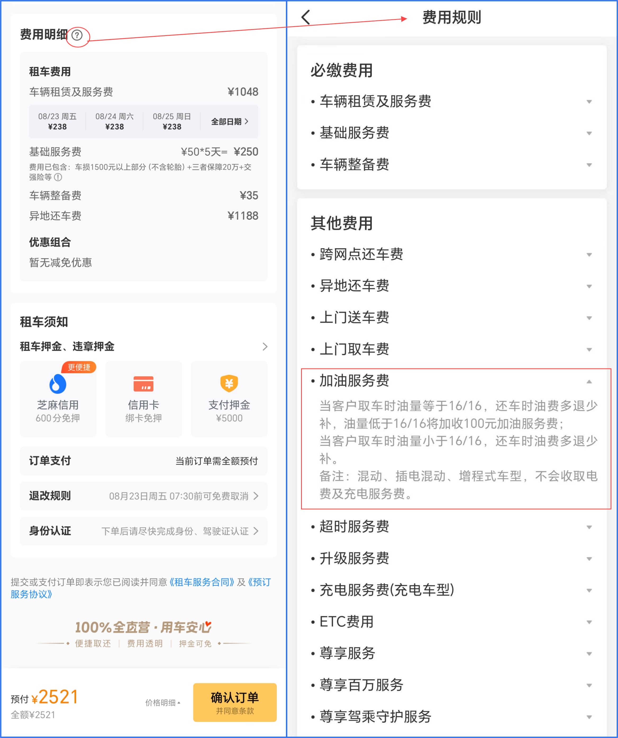 《中國(guó)消費(fèi)者報(bào)》在神州租車(chē)APP上下單租車(chē),經(jīng)過(guò)仔細(xì)找尋,發(fā)現(xiàn)必須點(diǎn)開(kāi)“費(fèi)用明細(xì)”旁邊一個(gè)不起眼的圓圈小問(wèn)號(hào)圖標(biāo)后,才會(huì)跳轉(zhuǎn)至標(biāo)注著“費(fèi)用規(guī)則”的清單。在“其他費(fèi)用”一欄中包括了“加油服務(wù)費(fèi)”,點(diǎn)開(kāi)后灰色小字顯示“當(dāng)客戶(hù)取車(chē)時(shí)油量等于16/16,還車(chē)時(shí)油費(fèi)多退少補(bǔ),油量低于16/16將加收100元加油服務(wù)費(fèi)”。