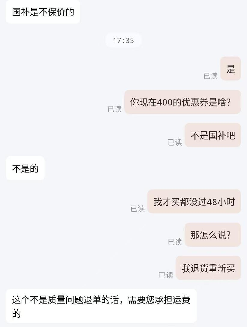 面對(duì)這突如其來(lái)的降價(jià),李先生深感憤怒與無(wú)奈。他嘗試通過(guò)平臺(tái)客服協(xié)調(diào)退還差價(jià),但得到的答復(fù)卻是:由于產(chǎn)品享受了政府補(bǔ)貼,差價(jià)不予退還。李先生氣憤地表示:“有種被當(dāng)傻子耍的感覺(jué)?!苯?jīng)過(guò)多次溝通,李先生最終與客服協(xié)商達(dá)成了無(wú)條件退貨的協(xié)議,退貨運(yùn)費(fèi)由平臺(tái)承擔(dān)。隨后,李先生又用家人的賬號(hào)領(lǐng)取政府補(bǔ)貼后,加上新的活動(dòng)優(yōu)惠,以低于原購(gòu)買(mǎi)價(jià)500元的價(jià)格于同一網(wǎng)購(gòu)平臺(tái)再次購(gòu)買(mǎi)了同一款空氣凈化器。