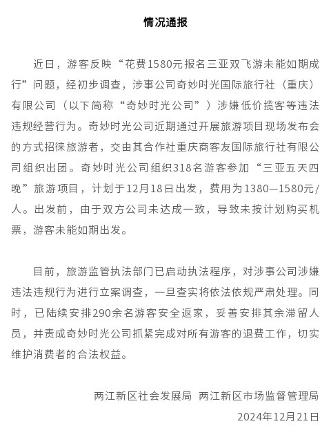 據(jù)通報(bào),經(jīng)初步調(diào)查,涉事公司奇妙時(shí)光國(guó)際旅行社(重慶)有限公司(以下簡(jiǎn)稱“奇妙時(shí)光公司”)涉嫌低價(jià)攬客等違法違規(guī)經(jīng)營(yíng)行為。奇妙時(shí)光公司近期通過開展旅游項(xiàng)目現(xiàn)場(chǎng)發(fā)布會(huì)的方式招徠旅游者,交由其合作方重慶商客友國(guó)際旅行社有限公司組織出團(tuán)。奇妙時(shí)光公司組織318名游客參加“三亞五天四晚”旅游項(xiàng)目,計(jì)劃于12月18日出發(fā),費(fèi)用為每人1380至1580元。出發(fā)前,由于雙方公司未達(dá)成一致,導(dǎo)致未按計(jì)劃購(gòu)買機(jī)票,游客未能如期出發(fā)。