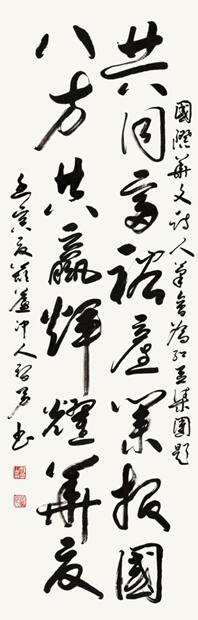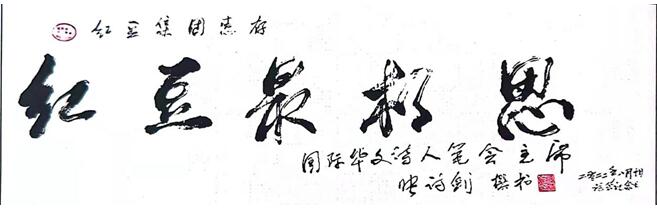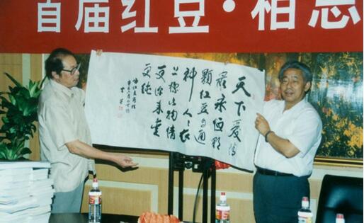 在《七夕,紅豆最相思的詩意探訪》論壇主題引導(dǎo)下,詩人們暢談紅豆愛情詩的淵源,以及對中國新詩的助推、發(fā)展的歷史作用,使中華文化傳統(tǒng)薪火相傳,在我們這一代詩人手里發(fā)揚光大,繪出獨特的、現(xiàn)代人審美的愛情詩篇。會上,北京電視臺節(jié)目主持人、詩人黃殿琴朗誦了張詩劍、桂興華、綠島寫的紅豆愛情詩歌,并展示了多位詩人等為紅豆集團寫的多幅書法,表達(dá)了友誼深情。“共同富裕產(chǎn)業(yè)報國 八方共贏輝煌華夏”是詩人黎勇先生寫給紅豆集團的書法 ,國際華文詩人筆會主席張詩劍寫給紅豆集團書法為“紅豆最相思”等。