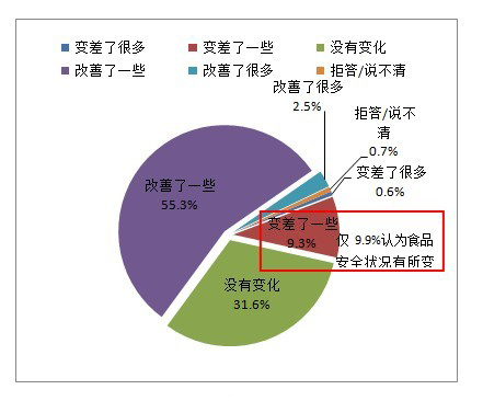 過去一年,國家多個部門發(fā)布了食品行業(yè)的新政策與新法規(guī),對食品工業(yè)行業(yè)嚴加把關(guān),多數(shù)市民也認為食品安全狀況得到了改善。55.3%的市民認為食品安全狀況改善了一些,2.5%的市民認為食品安全狀況改善了很多,而在2011年只有35.4%的受訪者認為食品安全狀況在過去一年有所改變,2012年比2011年提升19.9%。