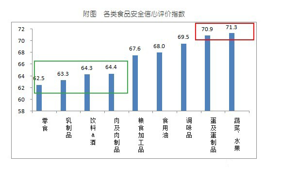 各類食品中,市民對蔬菜水果、蛋及蛋制品的安全最有信心,分別高達71.3和70.9;而對零食、乳制品、飲料&酒和肉及肉制品的食品安全評價較低,全部低于65。而在2011年,消費者對食品安全的評價中,肉及肉制品、乳制品的信心評價也較低。