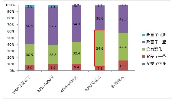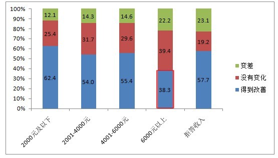 收入水平在6000元以上的市民,認為過去一年食品安全沒有改善的人數(shù)遠大于認為有所改善的人數(shù)!