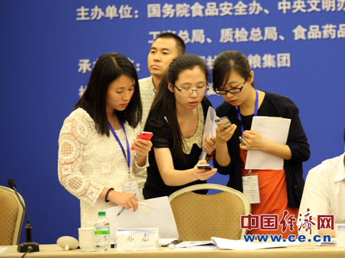 2013年全國食品安全宣傳周啟動儀式暨第五屆中國食品安全論壇6月17日在北京舉辦,今年主題為“社會共治 同心攜手維護(hù)食品安全”。圖為參會記者進(jìn)行交流。中國經(jīng)濟(jì)網(wǎng) 王耀峰/攝