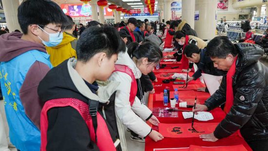 文化展示區(qū)里,傳統(tǒng)韻味與暖心服務(wù)交織成獨(dú)特風(fēng)景。鐵路部門、大連車站派出所、大連市慈善總會、大連青年書協(xié)的書法愛好者們揮毫潑墨,一幅幅春聯(lián)、一個個福字飽含美好祝愿,免費(fèi)送到旅客手中;紅包拓印體驗(yàn)更讓大家親手解鎖新春儀式感,沉浸式感受傳統(tǒng)年俗的魅力。大連北站的非遺展示區(qū)人氣爆棚:剪紙藝人指尖生花,一張張馬年主題剪紙惟妙惟肖;吹糖人、面塑攤位前,孩子們圍攏觀望,老師傅們巧手翻飛,將滾燙的糖漿、柔軟的面團(tuán)化作形態(tài)各異的小動物,引得陣陣歡呼;五谷畫展臺則以各色谷物為料,勾勒出寓意吉祥的新春圖景,讓旅客直觀感受傳統(tǒng)技藝的匠心與溫度。