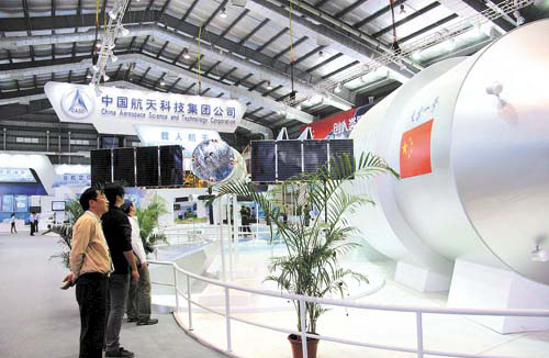 在第八屆中國國際航空航天博覽會中,中國航天科技集團(tuán)公司推出代表月球探測工程最新成果的“嫦娥二號”衛(wèi)星模型,代表“北斗導(dǎo)航”工程、直徑達(dá)7米、蔚為壯觀的天地一體衛(wèi)星運(yùn)行沙盤,1:1的“天宮一號”目標(biāo)飛行器模型、新一代運(yùn)載火箭以及代表深空探測計(jì)劃的“螢火一號”衛(wèi)星模型等國家重大工程項(xiàng)目近100項(xiàng)新展品首次亮相。